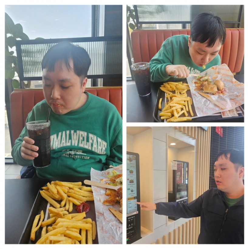 한*렬 이용인이 좋아하는 햄버거를 먹으러 출발~~!! 도너츠의 달콤함에 햄버거의 든든함까지 더해지니, 하루 종일 마음도 배도 꽉 찬 날이 되었습니다.