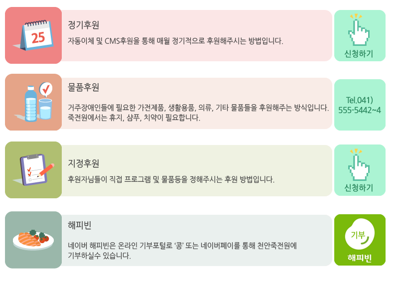 천안죽전원에서는 매달 5일. 10일 20일, 25일 날짜로 후원하실수 있습니다.